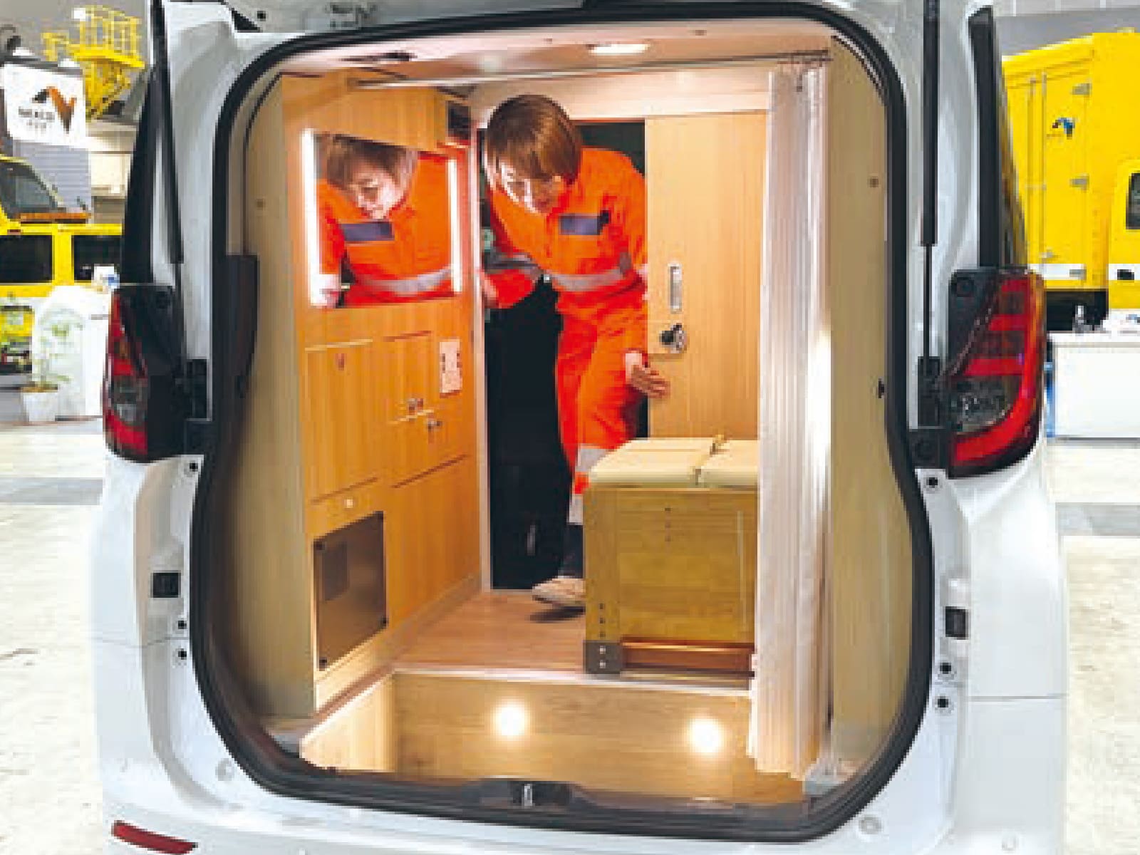 「現場に女性用トイレがない」「トラックの荷台に乗せたくみ取り式トイレに入りにくい」など、女性技術者の声をもとに開発された多機能車両。女性も働きやすい現場環境を整備するため、清潔なトイレ空間を備えた移動用車両を開発しました。トイレ機能、休憩スペース、パウダースペースを完備しています。